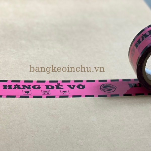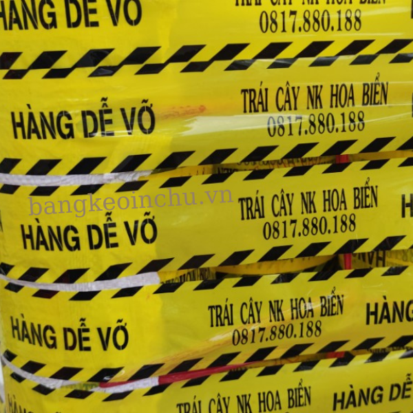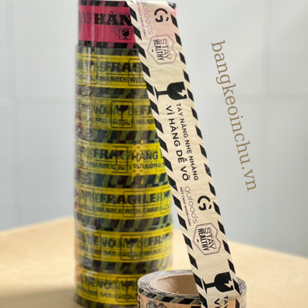 Là một loại băng keo màu chủ đạo là vàng và đen, vàng ( có thể thay đổi màu tuỳ sở thích của khách hàng ), nền đen là dòng “chữ hàng dễ vỡ”, cách phối màu giúp nội dung được nổi trội và dễ nhận diện hơn. Được sử dụng nhiều trong các bưu kiện hàng hóa, niêm phong hàng hóa, bưu điện bưu phẩm,...Có độ bám dính chắc chắn, không đứt không bị nhã keo khi đóng gói nên mới được sử dụng để tránh các trường hợp đánh tráo hàng hoá. Băng keo in chữ hàng dễ vỡ có thể để lâu mà không sợ bị khô keo hay bong tróc màu vì nó được làm từ các nguyên liệu ngoại nhập và cao cấp đảm bảo về chất lượng.